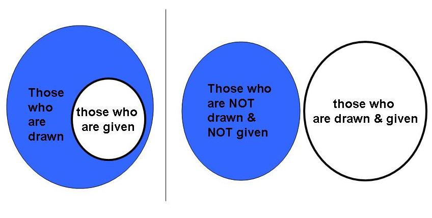 First, that all who are drawn by the Father (6:44) are the same people as those who are given to the Son (37). This is illustrated by the blue and white circles on the right. Second, that those who are given to the Son are the elect as defined by a Calvinist. And third, that the drawing and giving are describing the same operation which is performed on a person before they come to Jesus (believe).