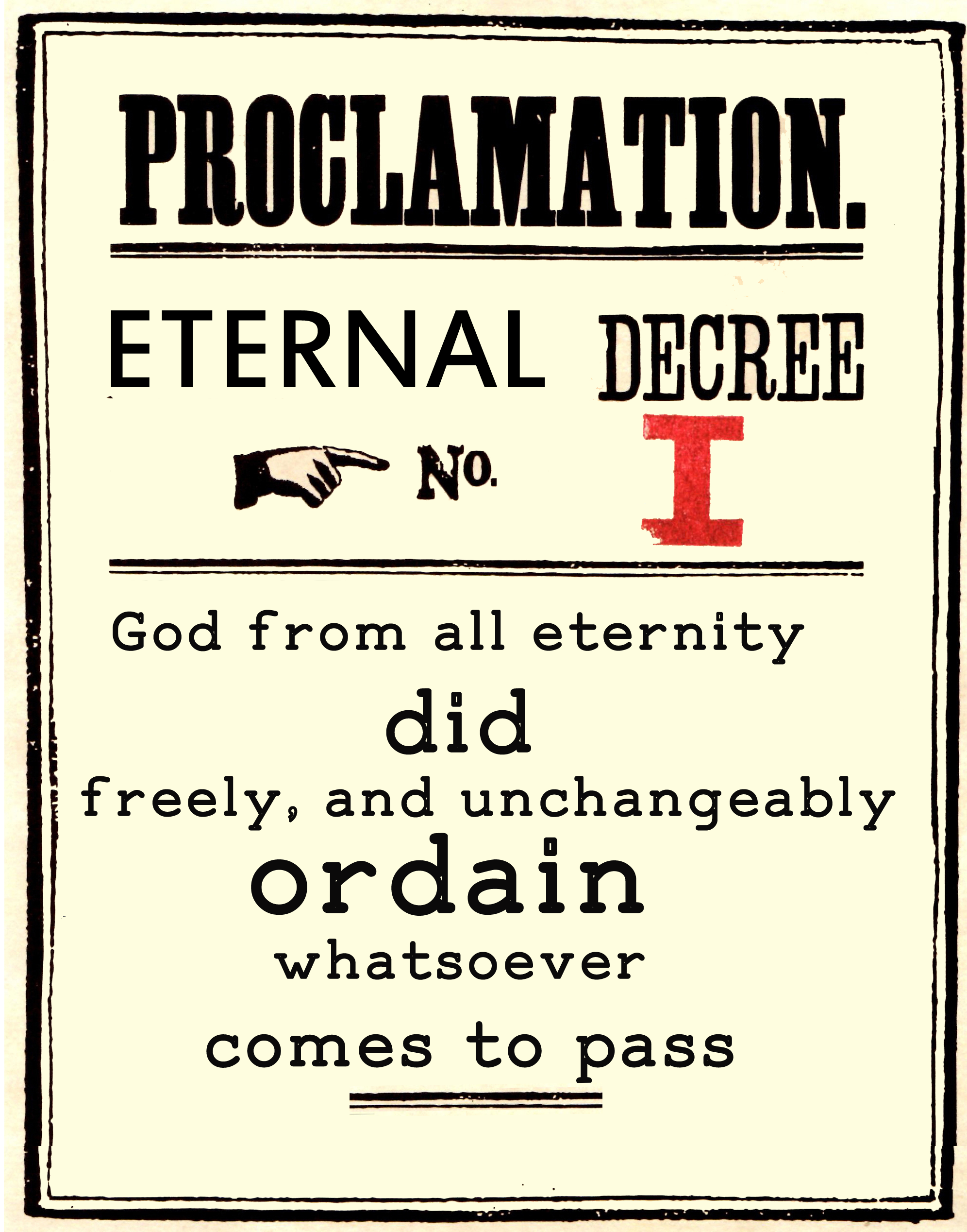 God from all eternity, did, by the most wise and holy counsel of His own will, freely, and unchangeably ordain whatsoever comes to pass