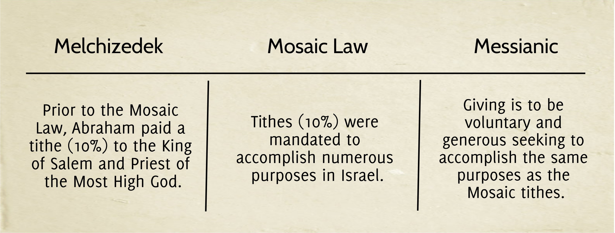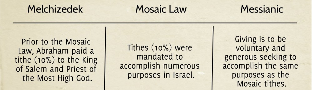 The first thing we need to understand is that the tithe (giving of 10%) is a principle that did not just exist under the Mosaic Law. Prior to the giving of the Law, Abraham tithed to Melchizedek (Gen 14:17-20) out of the spoils of war. According to the account Abraham gave voluntarily and eagerly and without being asked or commanded. It was to give glory to God who is “possessor of heaven and earth” and whom he acknowledges helped him achieve the victory (14:20,22-23). In giving to the Priest of God Most High, Abram was also acknowledging one who was greater than he was (Heb 7:4-10). Exactly who Melchizedek, the king and priest, was is a challenging study, but he is clearly considered a forerunner of the Messiah (Psalm 110:4; Heb 5:8-10; 7:1-3).