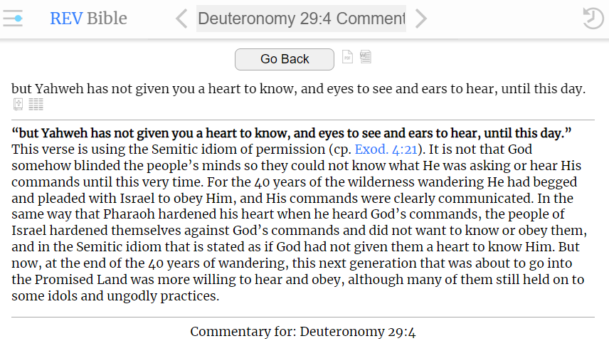 If we were to understand Deut 29:4 as an idiom it allows the passage to fit both the immediate context of the pericope as well as numerous other passages that we have explored. God is no longer at odds with Himself, both wanting the Israelites to know Him and actively hindering this by not giving them an “understanding mind, perceptive eyes, or discerning ears!”